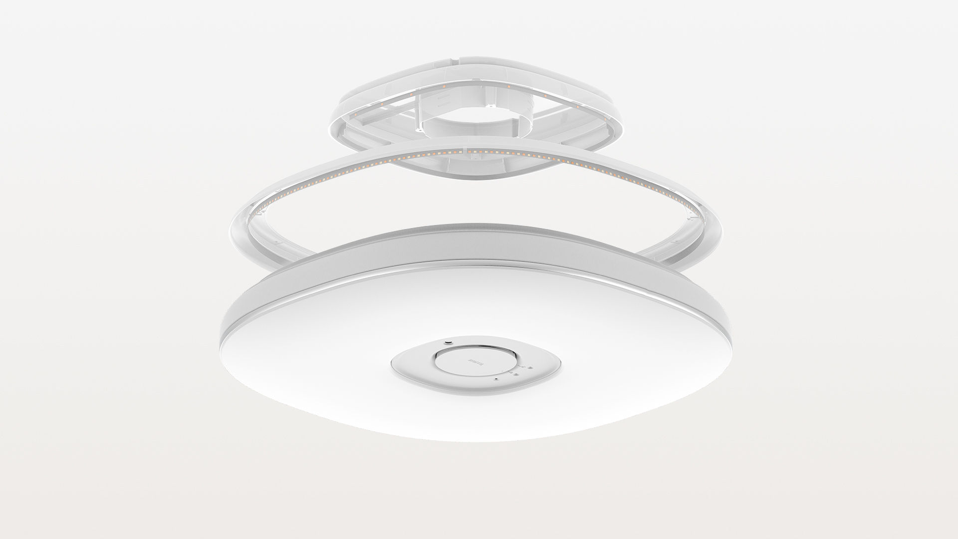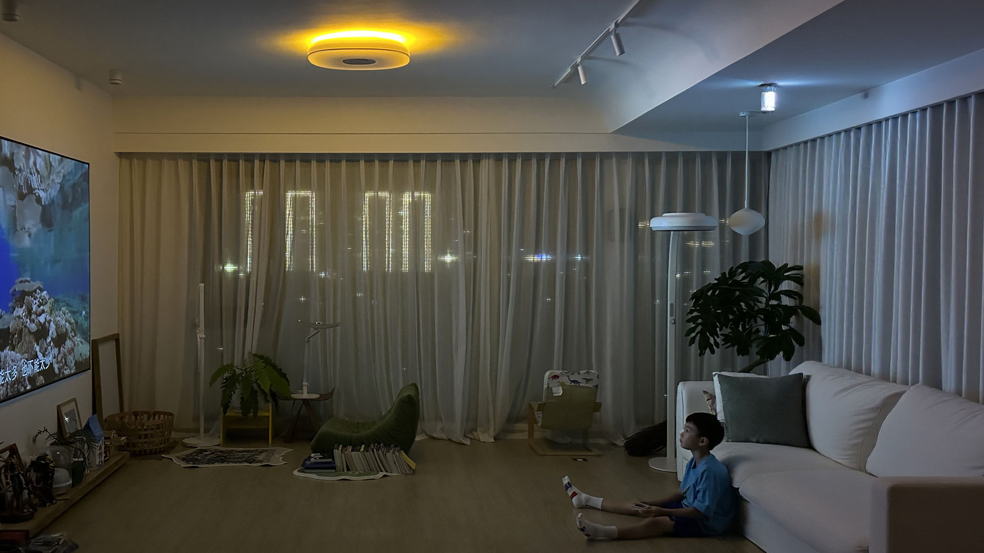 在这些指标中,明基Aora大主灯 的设计提供了一个相对成熟的解决方案: 它将主光、间接光与夜灯三层吸顶灯光源整合为一体,通过45°控光与环状反射结构实现UGR<10的柔光效果, 并利用节律算法自动调整光谱比例,使室内光环境在一天中自然变化。