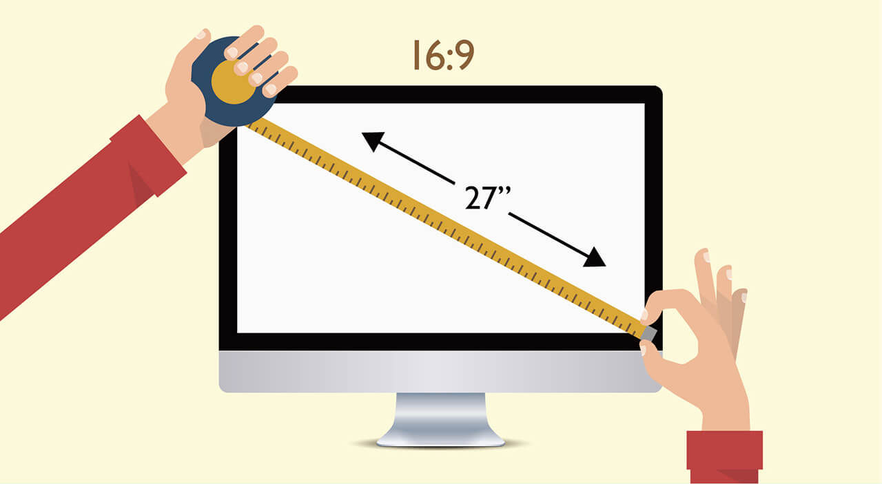 屏幕尺寸的测量方式很简单,面板对角线长度换算为英寸即可;目前影像工作领域主流的屏幕,多以27英寸16:9宽屏为主。