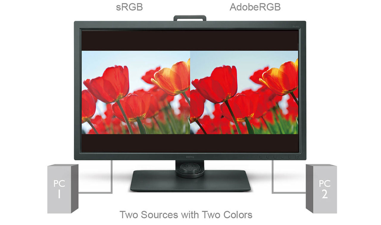 前文提到,摄影中常用的色域是Adobe RGB和sRGB。虽然一般建议优先使用Adobe RGB,但如果所拍摄的图片最终仅用于网页分享,实际上sRGB已经足够;或者当遇到两位摄影师拍摄的照片分别采用了不同色域时,如果屏幕支持双色域快速预览功能,就能在同一画面中即时预览比对,从而方便后续工作的进行。