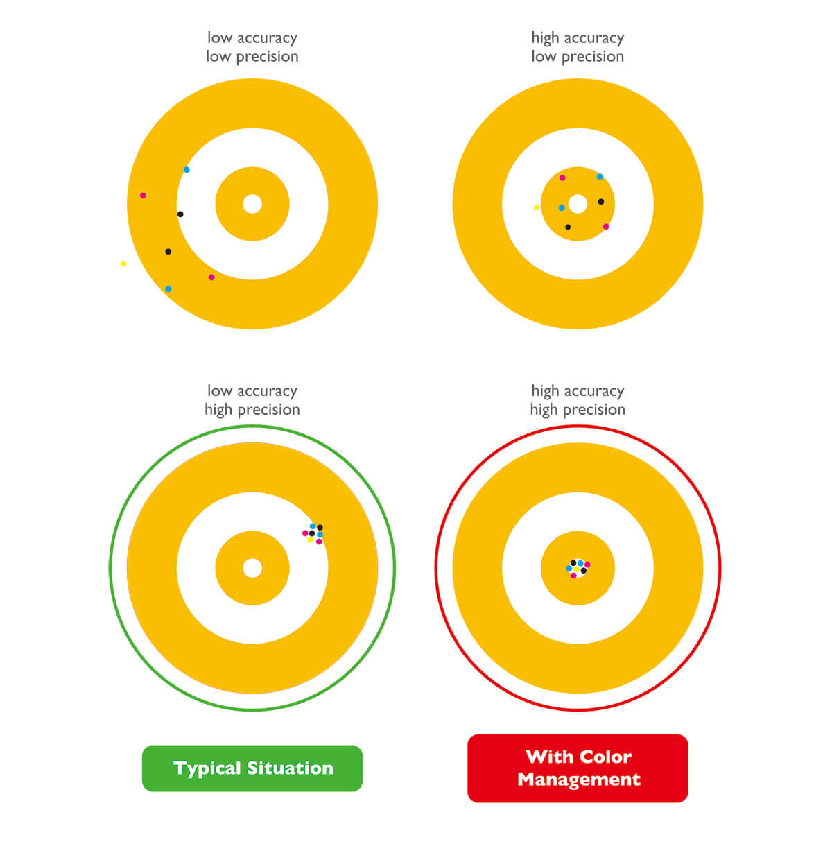 那么,对于使用软式打样的屏幕,有没有其他的要求呢?当然。除了屏幕需要校正外,色彩的准确性在这里也非常的重要。我们在这里用打靶练习的情境来解说色彩的准确性是多么的重要。在一般所使用的屏幕中,我们每次都会看到同样的颜色,但是这个颜色不一定会在靶心上,就像图二中左下角所示。但当我们应用色彩管理时,屏幕上每次显示的颜色就会很准确地在正中心,如图二中的右下角所示。这样可以确保使用者每次都看到的色彩都是一样的。
