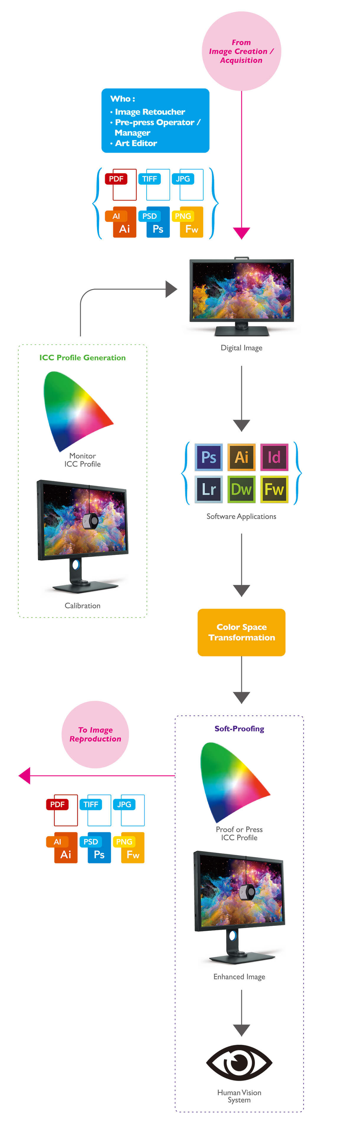 当一张影像产生后,这张影像通常都会被修图师加以美化。也就是说,所有的修饰工作都会在这个阶段完成。例如:增加亮度、提高饱和度、淡化皮肤的斑点等等。有时候,修图师、设计师或摄影师会是同一个人。但是不管这三个角色是否为同一人,都需要一台精准校色过的屏幕来完成这些工作。为什么呢?这个理由很简单,修图师需要一台显示器来正确反映应用到影像上的调整量,以免影像被过度调整或调整幅度不够。而对设计师来说也是一样的道理。从屏幕上来看影像,是唯一能够确认影像是否与设计师在脑海中想要设计出的一样的方法。如果一台屏幕无法正确地展现出原本应有的影像,那被优化过的影像将不一定是真的被“优化”过的影像。图一为典型的影像优化工作流程。