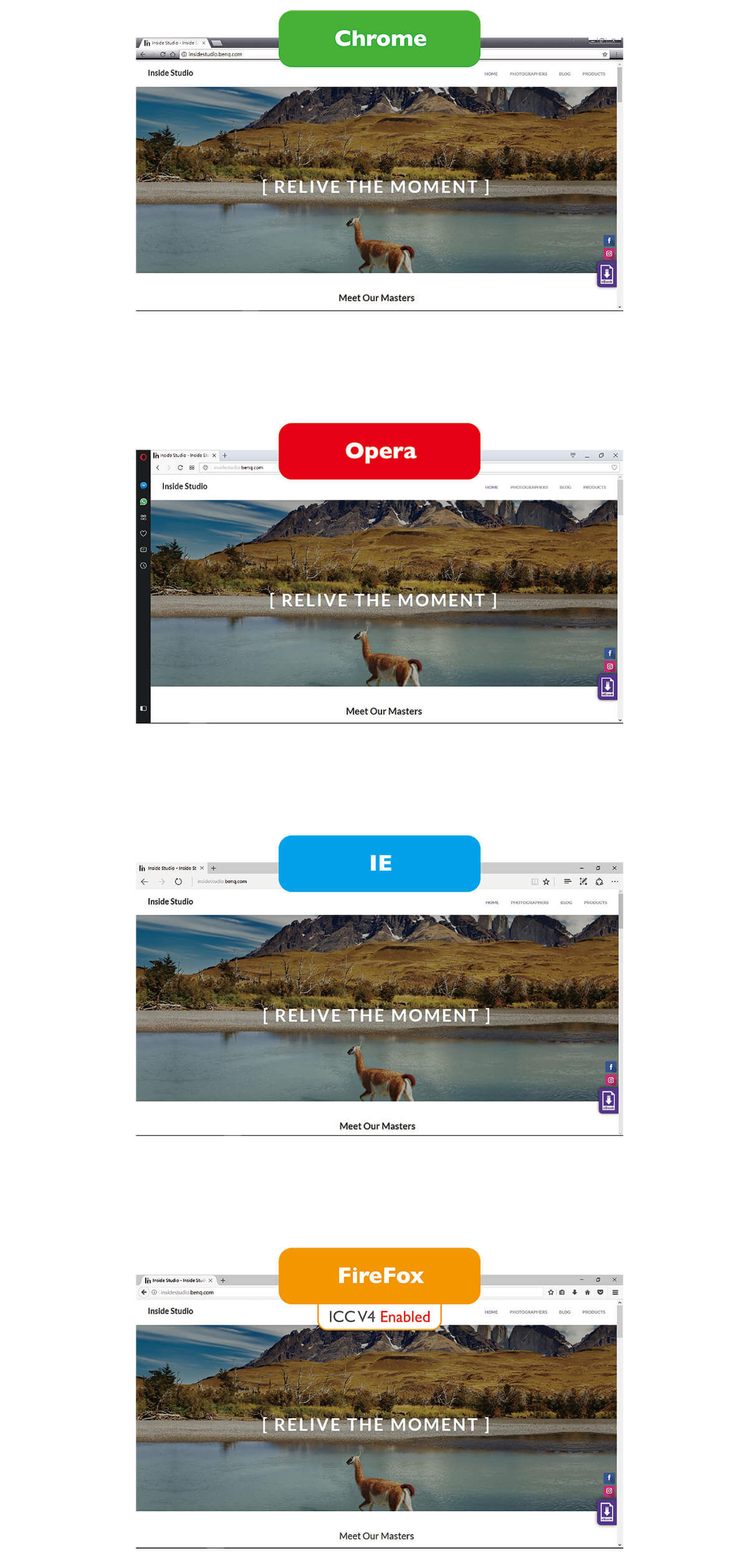 除了对显示设备进行校准以及将图像转换到sRGB色彩空间外,观看者还应注意使用哪款浏览器来查看图片。图五中有四种不同的浏览器,但显示的是同一个网站。然而,这些浏览器中显示的图像看起来却各不相同,这是因为并非每个浏览器都会在其引擎中使用最新的ICC引擎。因此,对于网页设计师或任何想要将图像上传到网站的人而言,使用不同的浏览器来检查图像是非常重要的。从图五中我们可以看到,IE和FireFox能够使用v4 ICC色彩描述文件正确再现图