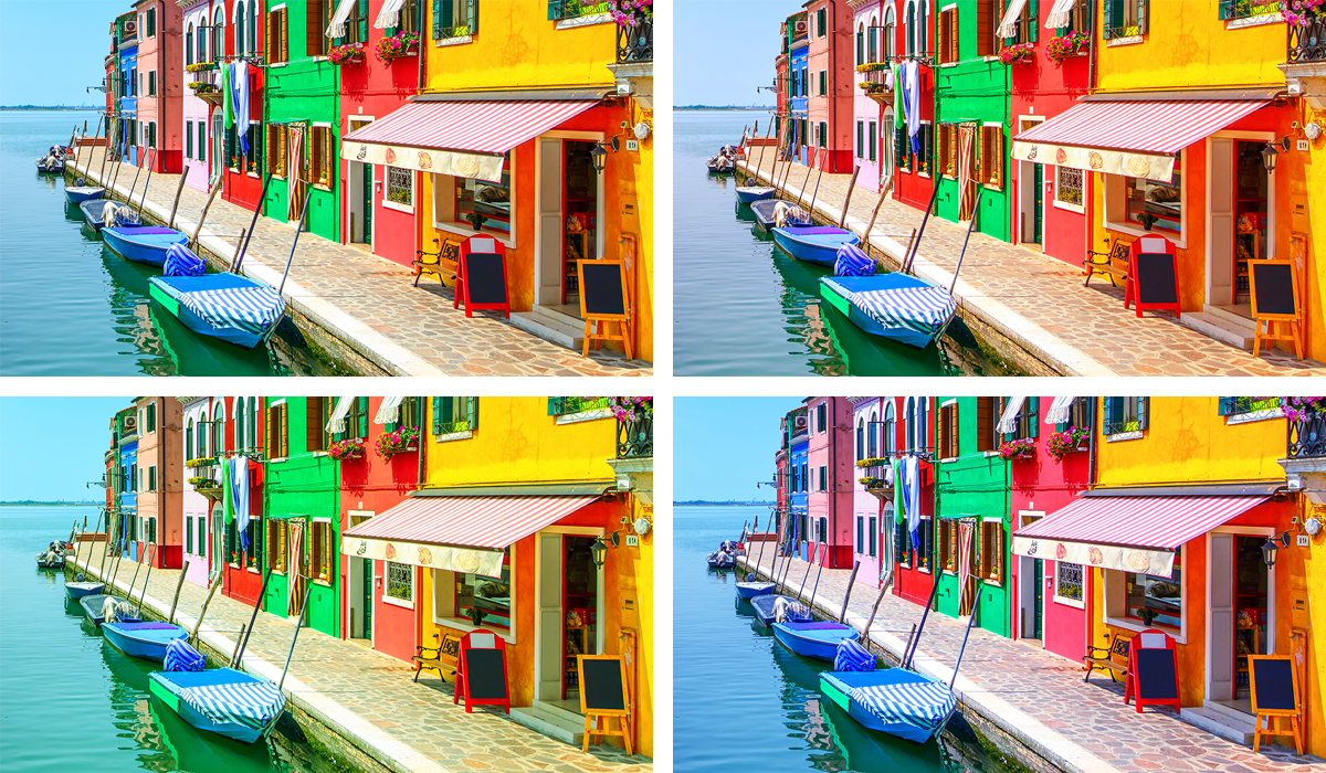 让我们看看下方展示的四张图片。每张图片显示在四款不同的显示器上。注意这些显示器上的颜色看起来有多不同。在这四台设备上做色彩管理之前,由于硬件技术和色彩设置的不同,色彩差异是非常显而易见的。你在家用显示器上看到的默认色彩设置(例如色温、饱和度和对比度),通常是为了满足日常使用的色彩需求而调试的,然而,对于商业印刷公司以及工作中需要色彩精准度的自由职业者和专业从业者来说,色彩管理是工作流程中必不可少的一环。