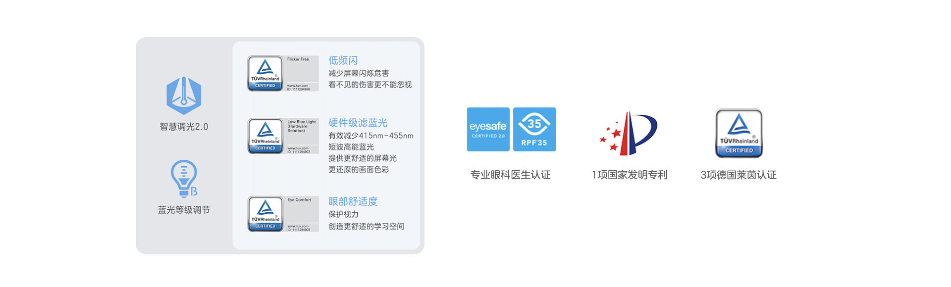 小派屏pro通过了全球安全机构莱茵认证的无频闪和硬件级滤蓝光。Eyesafe2.0认证说明显示器在保持鲜明色彩的同时减少蓝光对人眼的伤害。