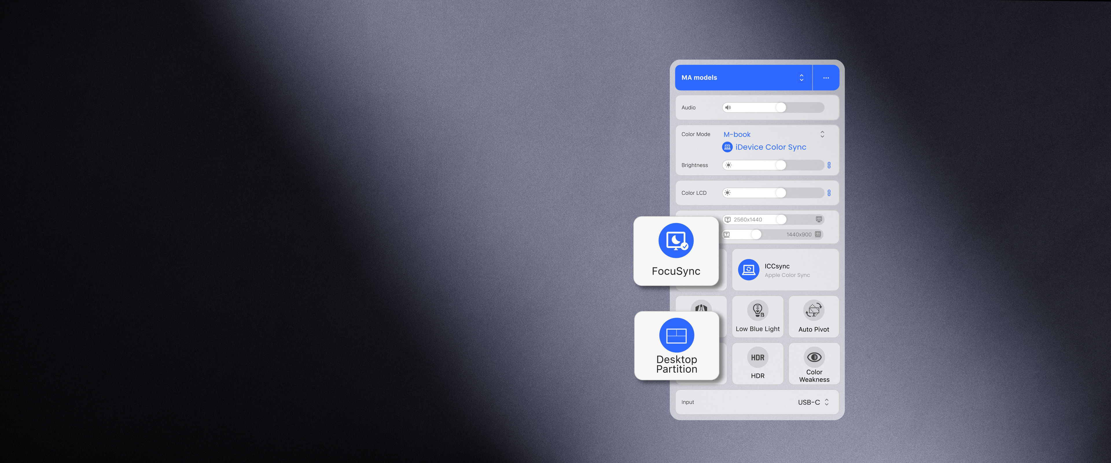 将Macbook的专注模式与我们的显示器同步。自定义色彩模式、低蓝光、音量和声音模式等高级设置,以更好地增强您的专注能力。